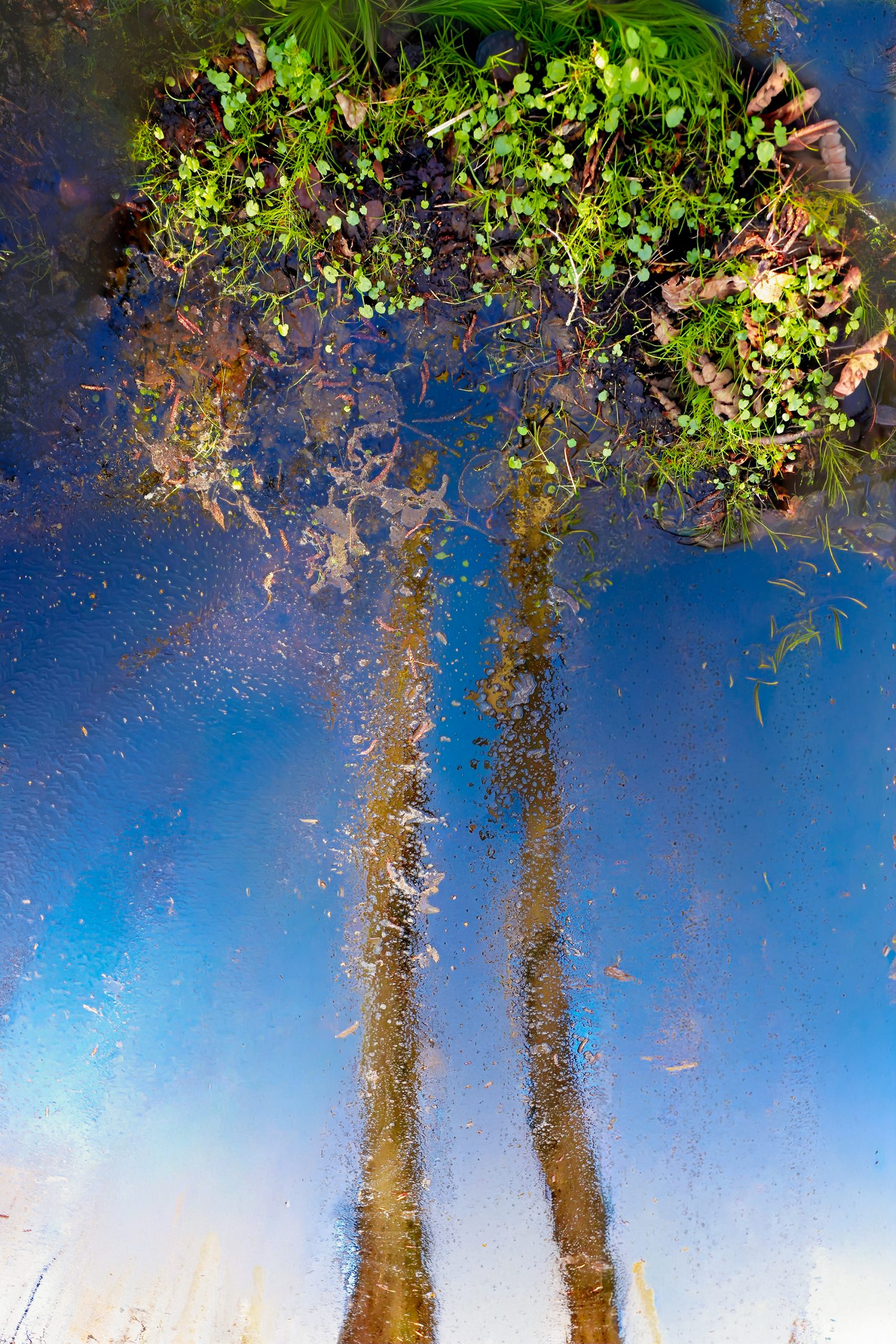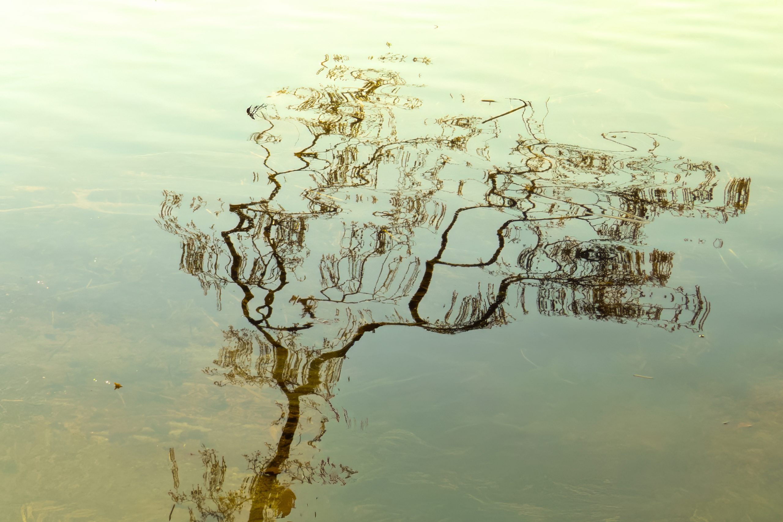 Der Blick in Waldteiche zeigt Bilder von surrealer Schönheit. Hier überlagern sich zwei oder drei Bilder: Die Spiegelbilder von Bäumen und Himmel, Blätter , die auf der Wasseroberfläche schwimmen, und der nur wenige Zentimeter tiefe, von modrigen Blättern bedeckte Boden, der im Sonnenlicht in einem intensiven Rot-Braun erstrahlt. Von diesen Bildern sehen wir immer den hellsten Teil; in den dunklen Stämmen also die im Sonnenlicht strahlenden Blätter des Bodens. Ich habe die Bilder auf den Kopf gestellt. Das führt dazu, dass die Spiegelbilder der Bäume aufrecht stehen und nicht als Spiegelbilder erkannt werden. Unser Gehirn steht vor der Herausforderung, diese Bilder neu zu interpretieren. Dabei entstehen reizvolle Widersprüche: Blätter in Baumstämmen, ein Blätterregen am Himmel, Sterne die vor den Bäumen strahlen… Alle Bilder sind käuflich (siehe „Kaufen“)